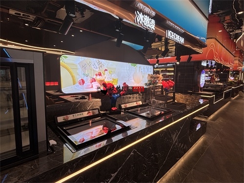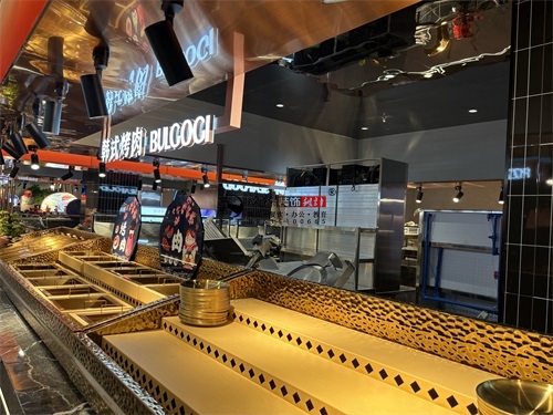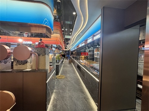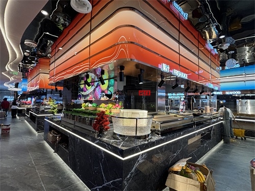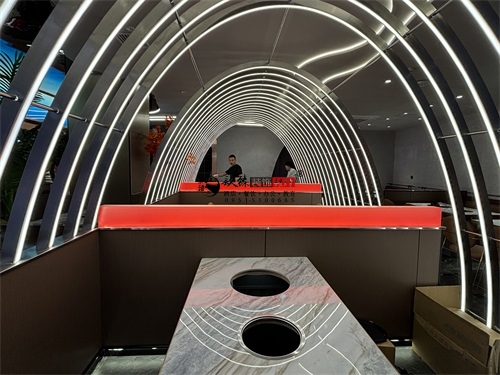 今天分享的是同心回香渔自助餐厅装修设计实景照片,整体而言,这家自助餐厅装修设计上精准踩中了“年轻时尚+功能实用”的餐饮装修趋势:用流动曲线、霓虹光影打造网红属性,用材质平衡、分区布局满足自助餐饮的实际需求,既适合朋友聚会的休闲场景,也能通过空间质感提升品牌调性。材质搭配上,自助餐厅采用“冷硬工业风+柔和轻奢感”的平衡策略:地面与餐台基座选用深色大理石与金属质感的饰面板,强化了空间的感与耐磨实用性;而卡座沙发、餐椅则采用暖橙色的软包材质,中和了石材与金属的冷硬,同时通过金属细框的椅架设计,保留了轻奢调性。
